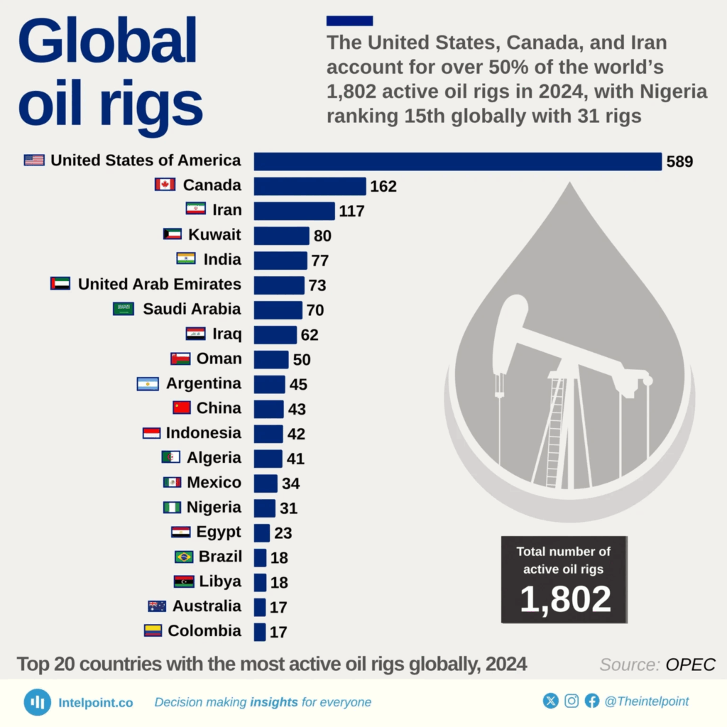 Meanwhile, data gathered by IntelPoint from the Organization of the Petroleum Exporting Countries (OPEC) showed that the United States remains the undisputed leader with 589 active oil rigs, accounting for nearly a third of all rigs worldwide in 2024.