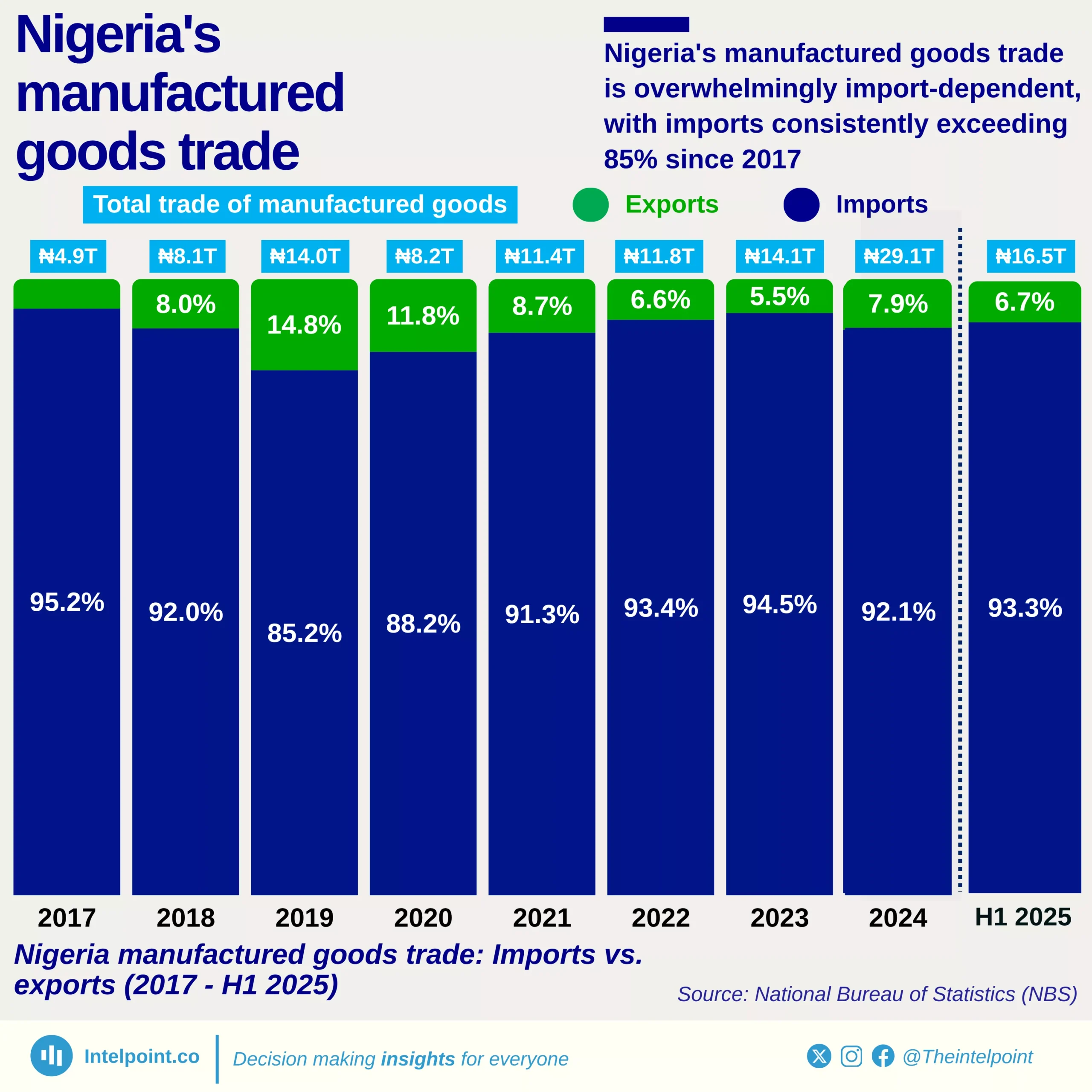 ₦7.88 trillion worth of manufactured goods made up 51.6% of imports, underscoring Nigeria’s dependence on foreign industrial products.