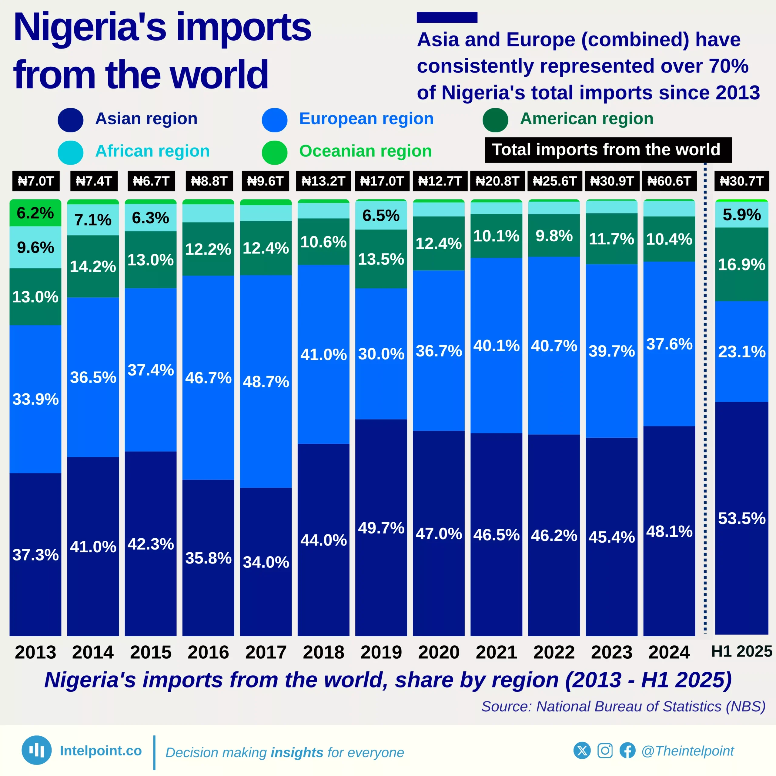 China remains Nigeria’s largest import partner, accounting for ₦4.96T or 32.45% of total imports—more than double the U.S.'s share.