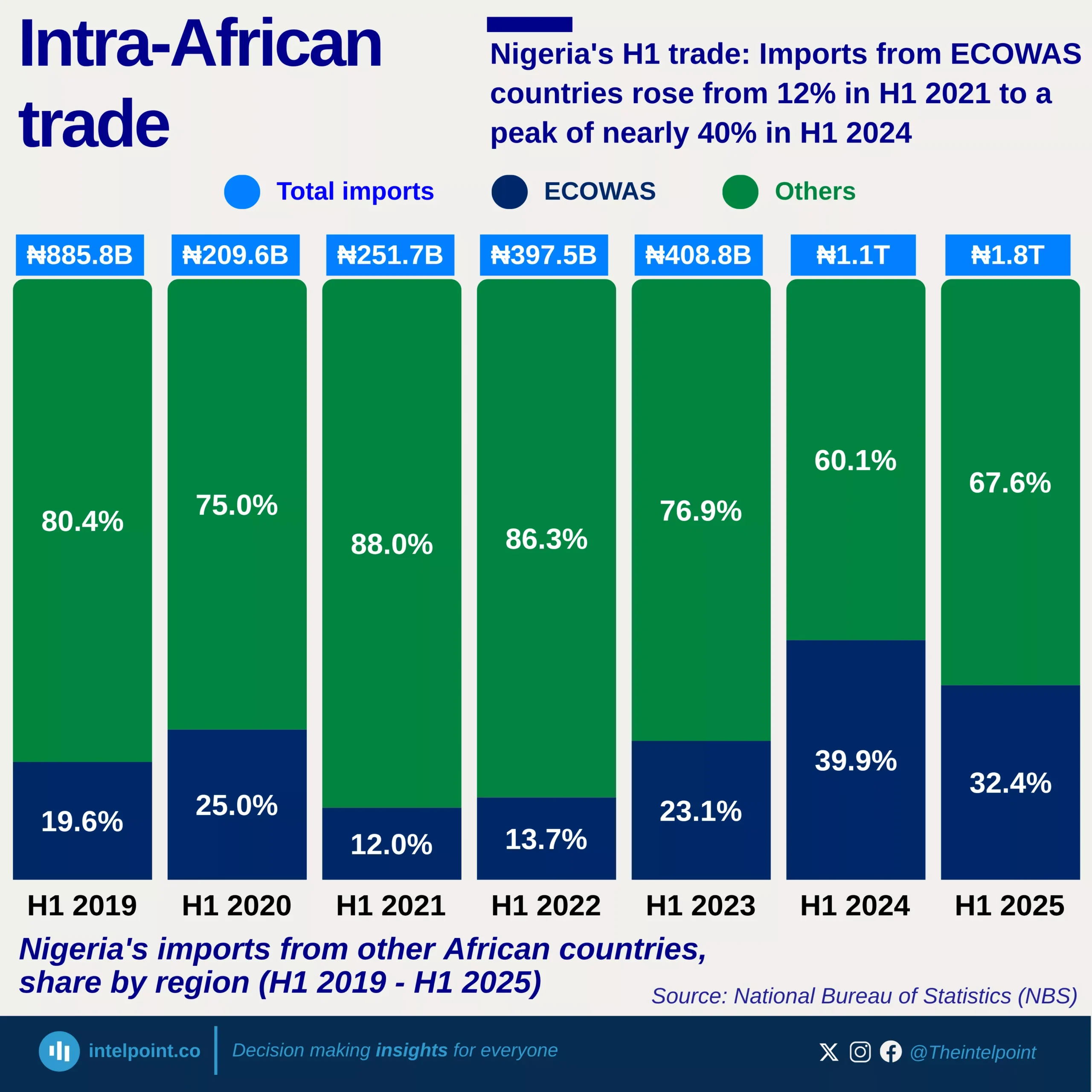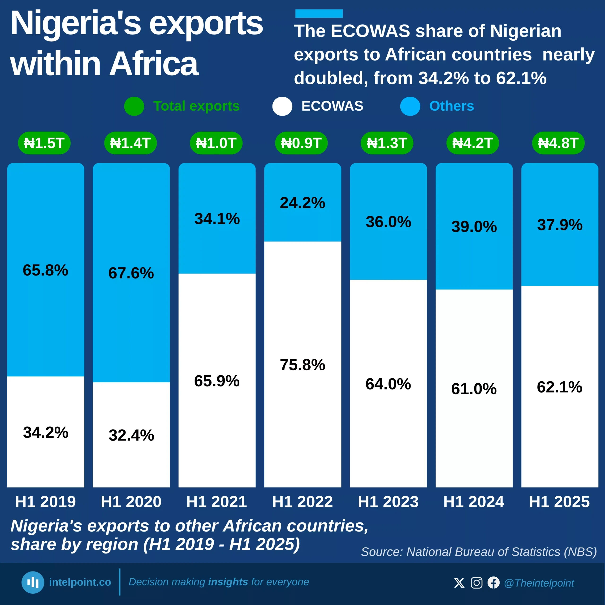 West Africa dominates Nigeria’s intra-African trade, with Togo, Côte d’Ivoire, and Ghana collectively accounting for a significant share of regional exports.