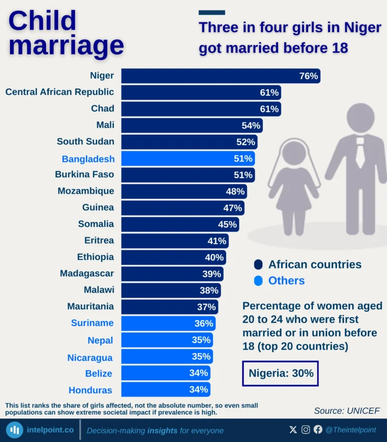 • Niger (76%), the Central African Republic (61%), and Chad (61%) top the global list, meaning the majority of women in these countries marry as children.