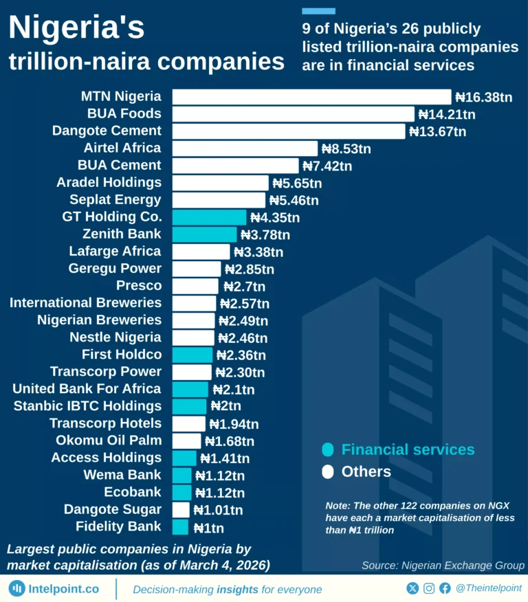 • MTN Nigeria leads at ₦16.38 trillion, making it the most valuable listed company.