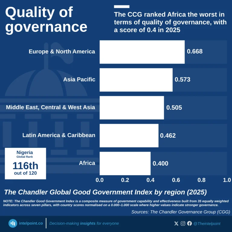 • Africa ranks last globally in governance quality with a score of 0.4.