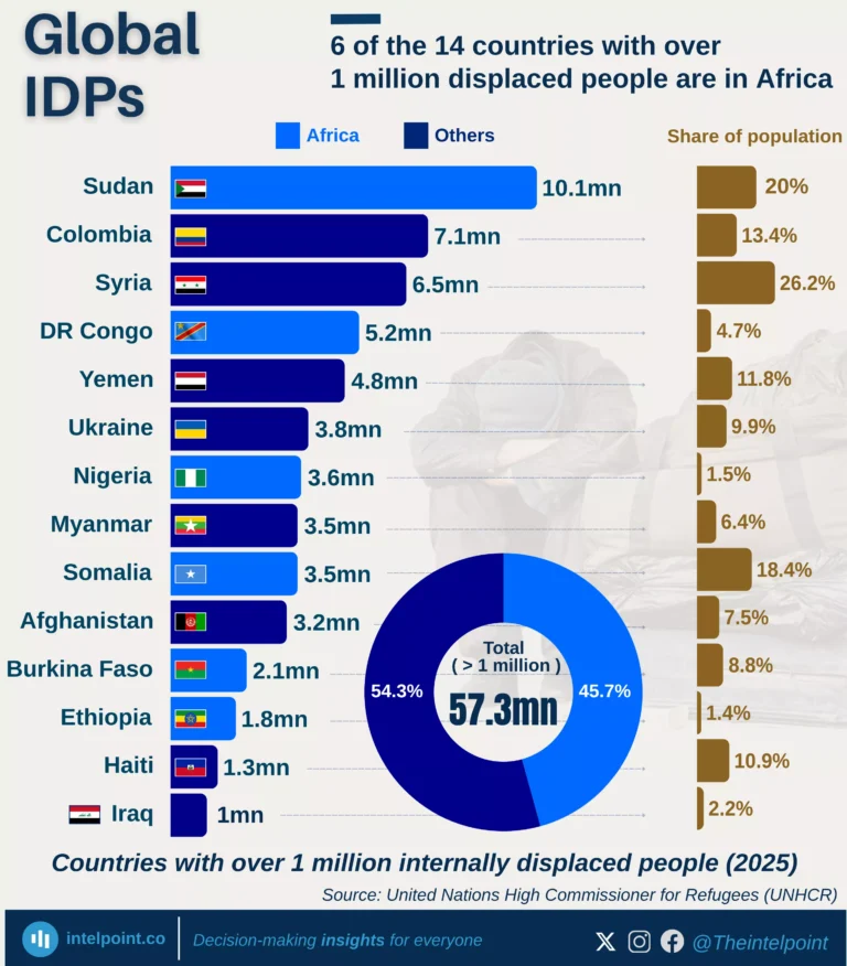 • Non-African countries like Colombia (7.1 million) and Ukraine (3.8 million) show that displacement is a global issue.