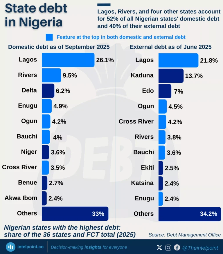 • Lagos dominates Nigeria’s subnational debt profile, accounting for 26.1% of domestic debt and 21.8% of external debt.