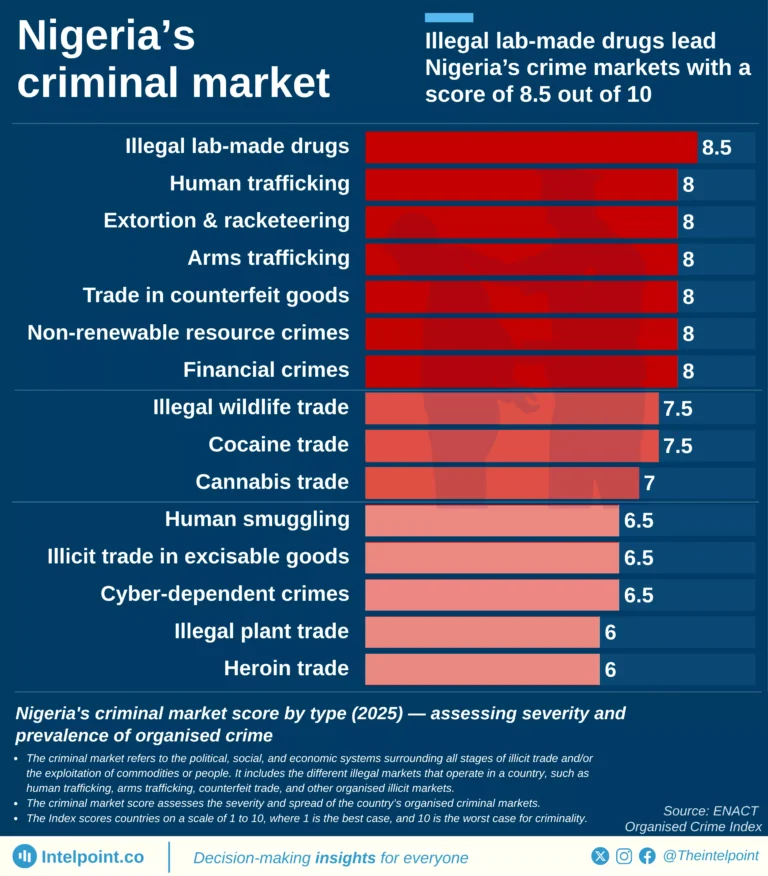 • Illegal lab-made drugs are Nigeria’s highest-scoring crime market at 8.5.
