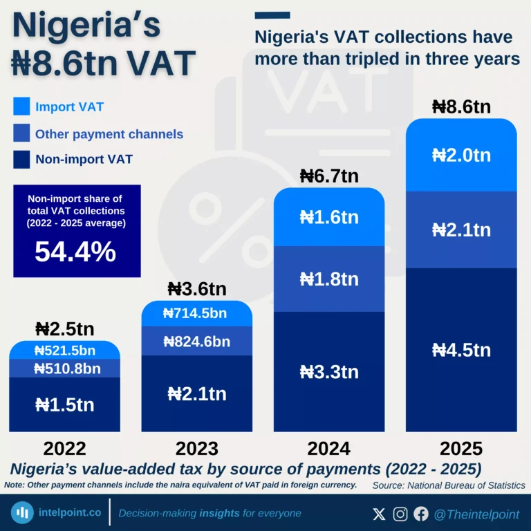 • Nigeria’s total VAT rose from ₦2.5tn in 2022 to ₦8.6tn in 2025.