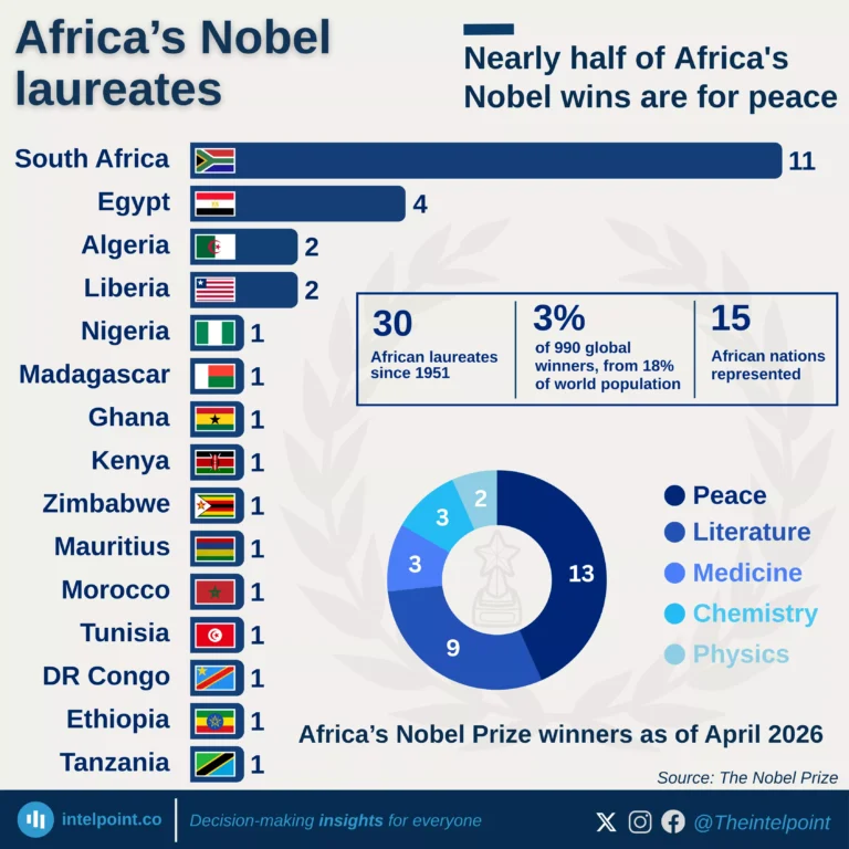 • Africa accounts for 3% of Nobel laureates despite being home to 18% of the world's population.