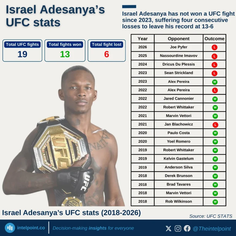 • Adesanya has lost his past four consecutive appearances, a sharp contrast to his earlier career, where his elite striking defence made stoppage losses rare.