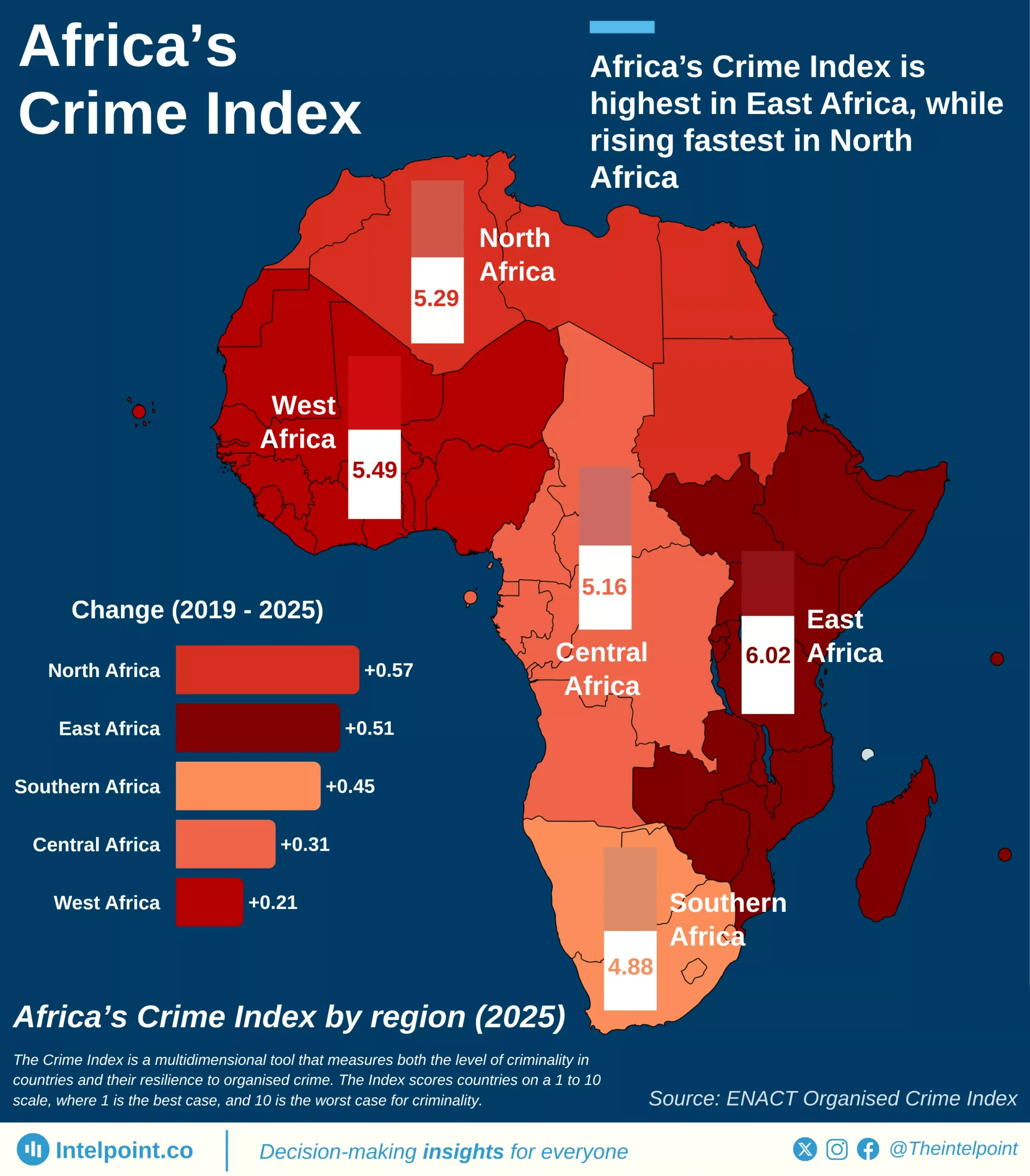 East Africa stands out with the highest Crime Index (6.02), but North Africa is also rising the fastest (+0.57 since 2019). West Africa (5.49) remains deeply exposed, while Central Africa (5.16) sits in a persistent middle ground of instability. Southern Africa, though lowest at 4.88, is still trending upward.