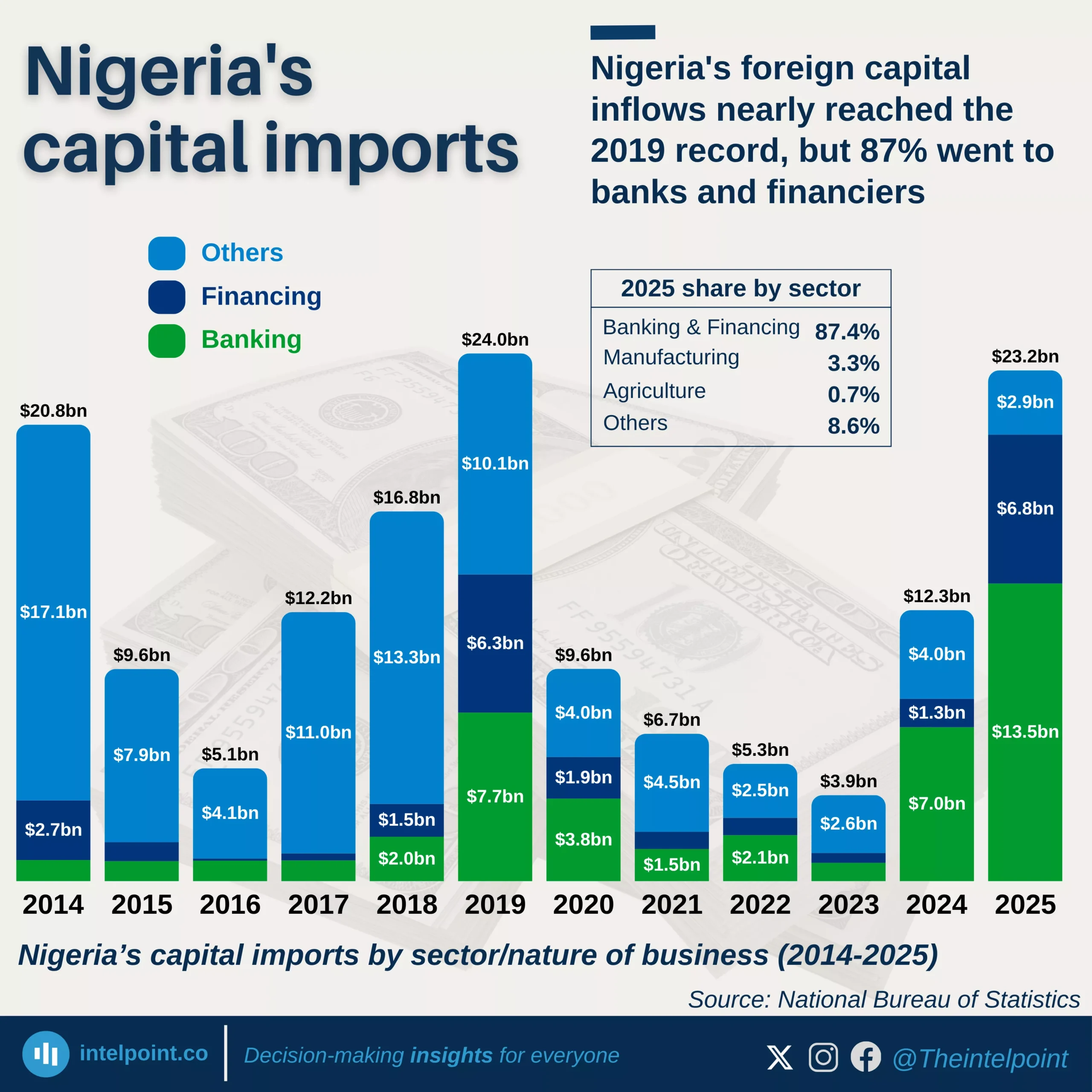 Nigeria’s capital importation has experienced a turbulent 12-year run. In 2013, the country attracted $21.3 billion in capital inflows, but by 2024, this figure had dropped to $12.3 billion, a 42% decline. The most significant drop, 60% in 2020, came after 2019’s record high of $24 billion. From 2020 to 2023, inflows continued to deteriorate, reaching a low of $3.9 billion. However, 2024 brought a strong reversal, with capital imports rebounding by 215%, hinting at renewed investor confidence or major financial transactions boosting inflows.