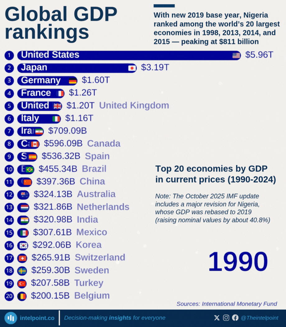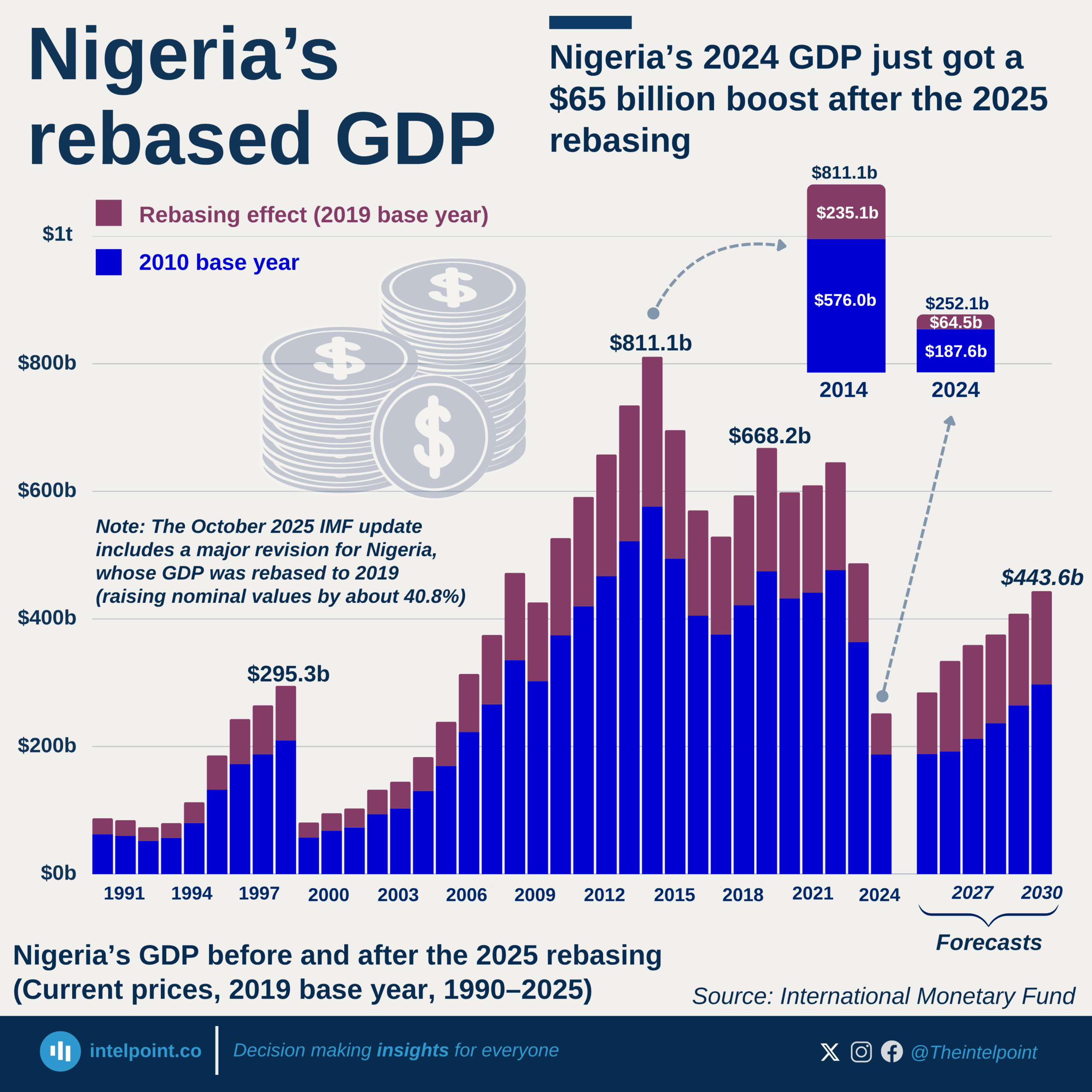 The IMF’s new 2019 GDP base year added between $20 billion and $235 billion annually to Nigeria’s GDP from 1990–2025.