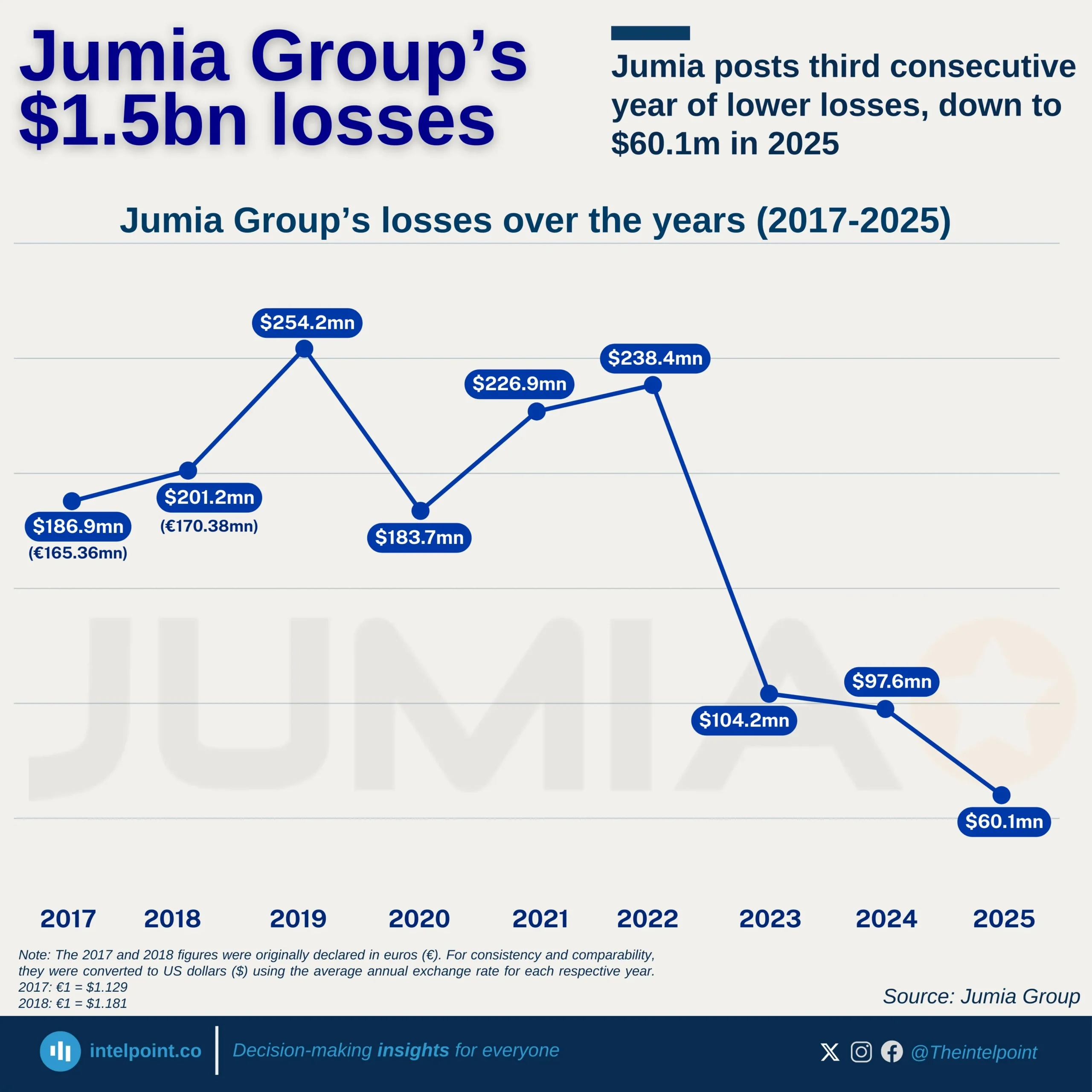 After peaking in its IPO year with a $254.2 million loss, Jumia Group struggled to contain red ink through the early post-listing years as expansion costs and operational inefficiencies weighed on performance. However, beginning in 2023, a strategic pullback, including the shutdown of select business lines and market exits across Africa, triggered a steep decline in annual losses from $238.4 million in 2022 to $104.2 million in 2023.