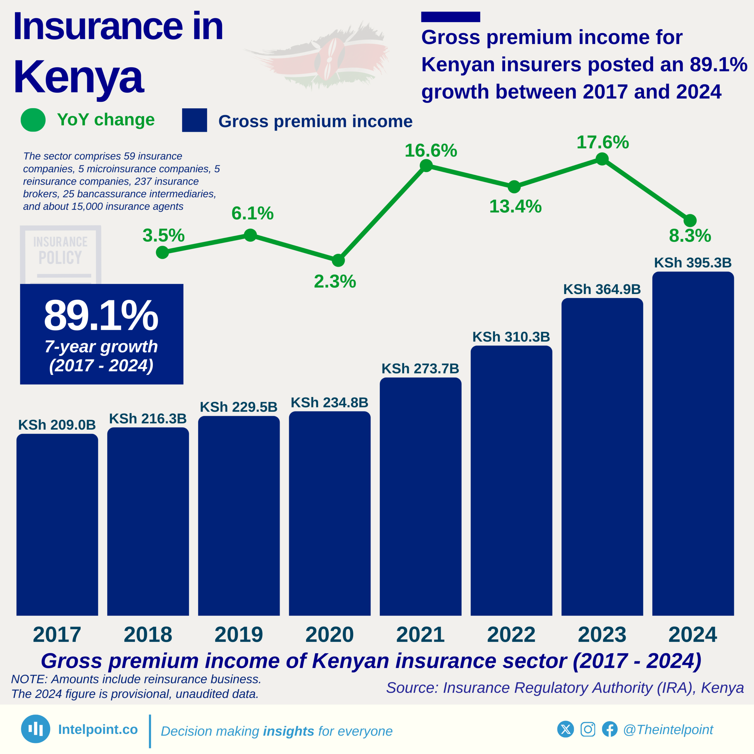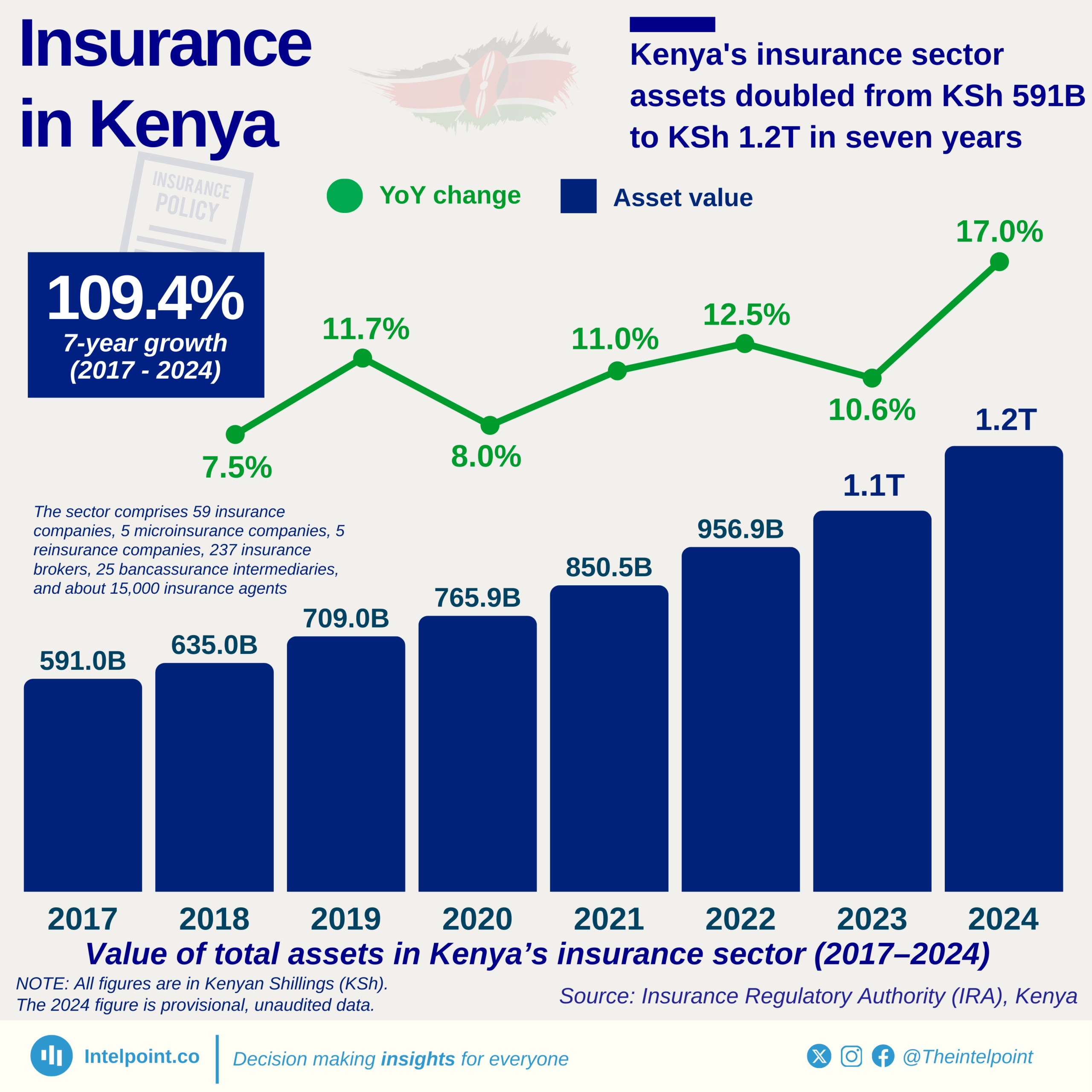 Kenya’s insurance sector has seen steady and impressive growth in its asset base over the past seven years, with total assets more than doubling from KSh 591 billion in 2017 to KSh 1.2 trillion in 2024. This represents a 109.4% increase, underscoring the sector’s expansion and increasing role in the country’s financial system. The consistent year-on-year growth highlights the sector’s stability and resilience, even in periods of economic uncertainty. Despite fluctuations in annual growth rates, the sector has maintained positive momentum throughout the period.
