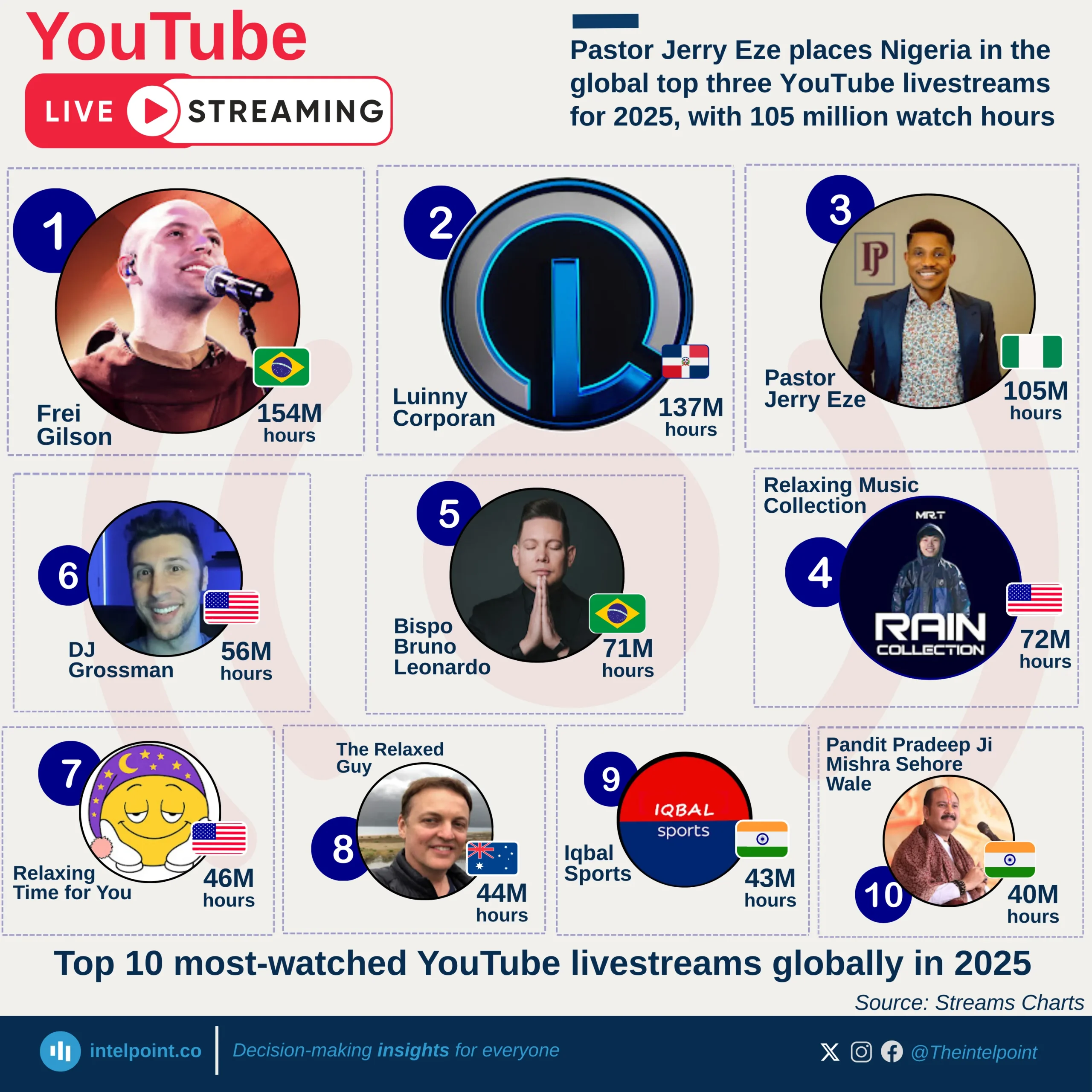Nathaniel Bassey Main’s livestream recorded 1.02 million concurrent viewers, placing Nigeria 6th globally by peak viewership. This positions Nigerian faith livestreams as not only high in total watch time but also capable of mobilising large, real-time global audiences, reinforcing Nigeria’s growing visibility in the global livestreaming ecosystem.