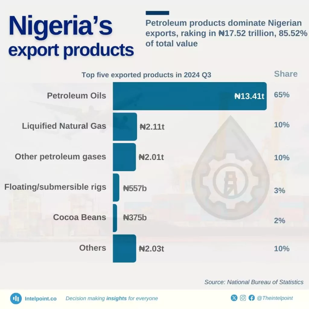 Nigeria's export value increased by 16.8% quarter-on-quarter to ₦20.49 trillion in Q3 2024. Petroleum products (oils, liquefied natural gas, and other petroleum gases) made up 85.52% of its exports, valued at ₦17.53 trillion.