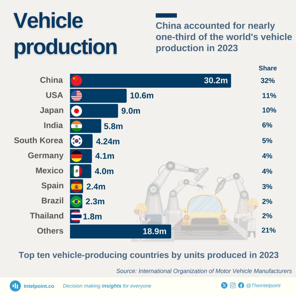 In 2023, global vehicle production surged, led by China with over 30 million vehicles — a 12% increase from 2022.