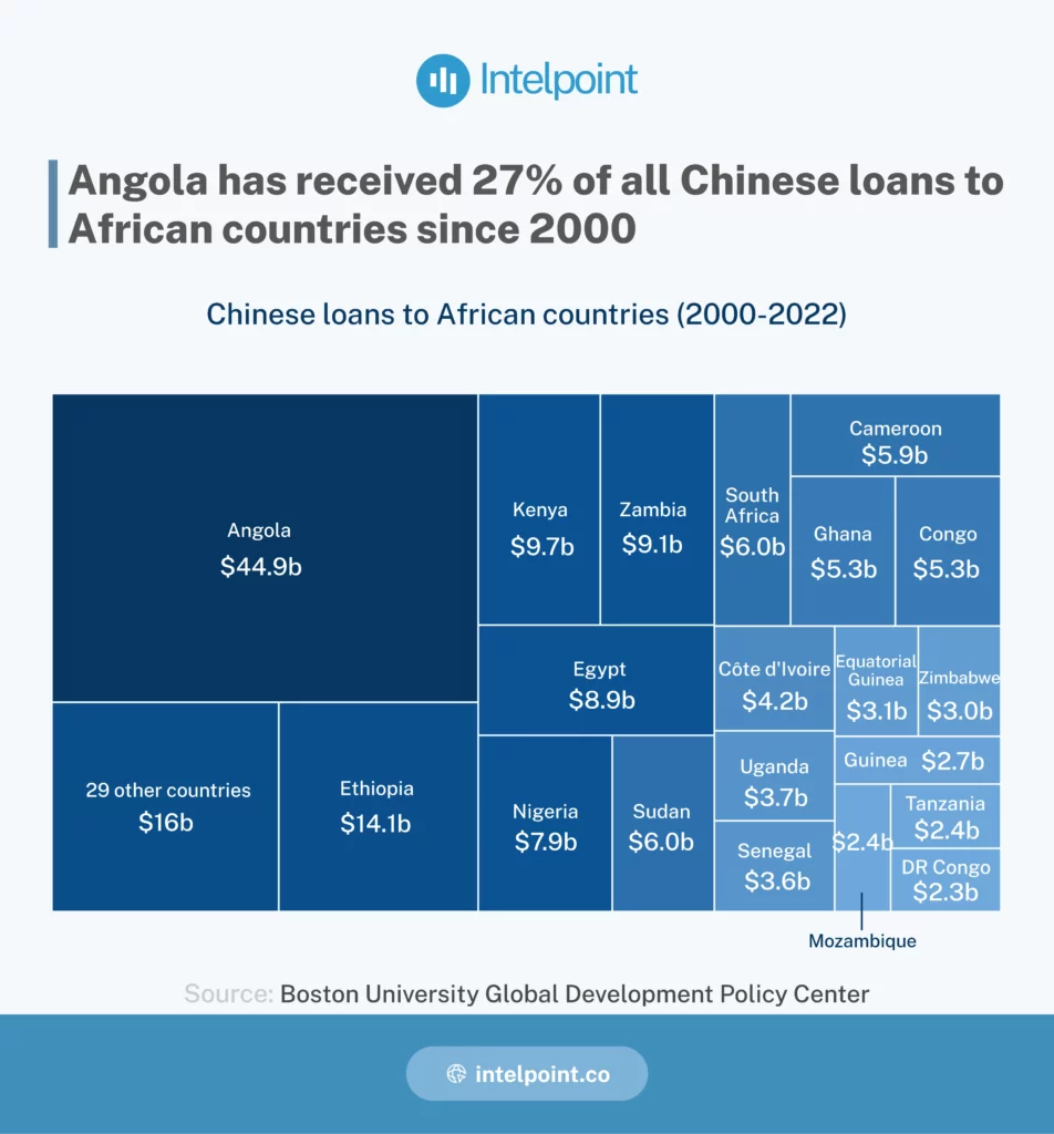 Data from the Boston University Global Development Policy Center shows that Chinese creditors have loaned African countries $167 billion since 2000, with Angola receiving 27% ($45 billion) of the amount. Ethiopia, Kenya, Zambia, and Egypt complete the top five.