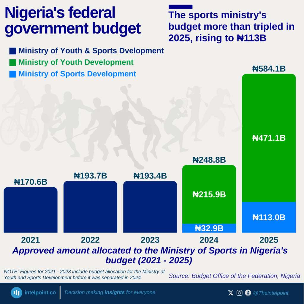 • Nigeria’s sports budget rose sharply to ₦113 billion in 2025, tripling from the 2024 figure.