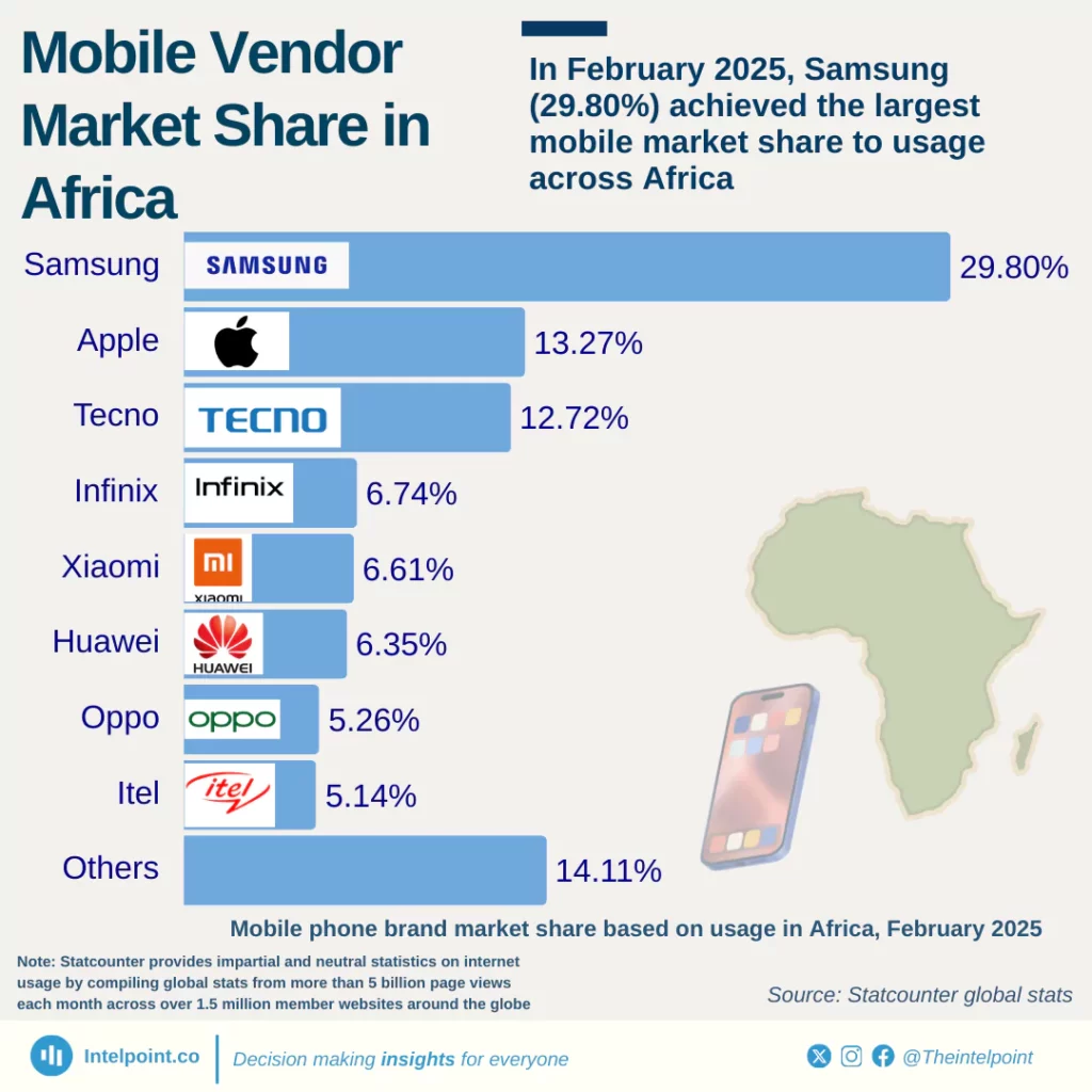 • In February 2025, Samsung and Apple dominate the mobile market in Africa.