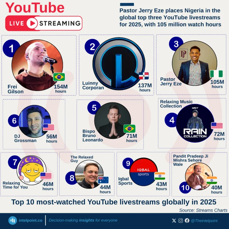 • Pastor Jerry Eze ranks 3rd globally, with 105 million hours watched, outperforming most entertainment and music livestream channels.
