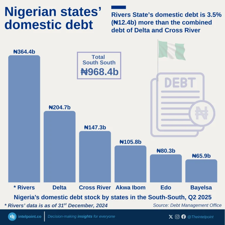 • Regional debt approaches ₦1 trillion: The six South-South states collectively hold an estimated ₦968 billion in domestic debt as of Q2 2025.