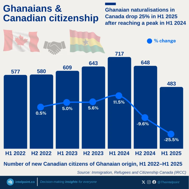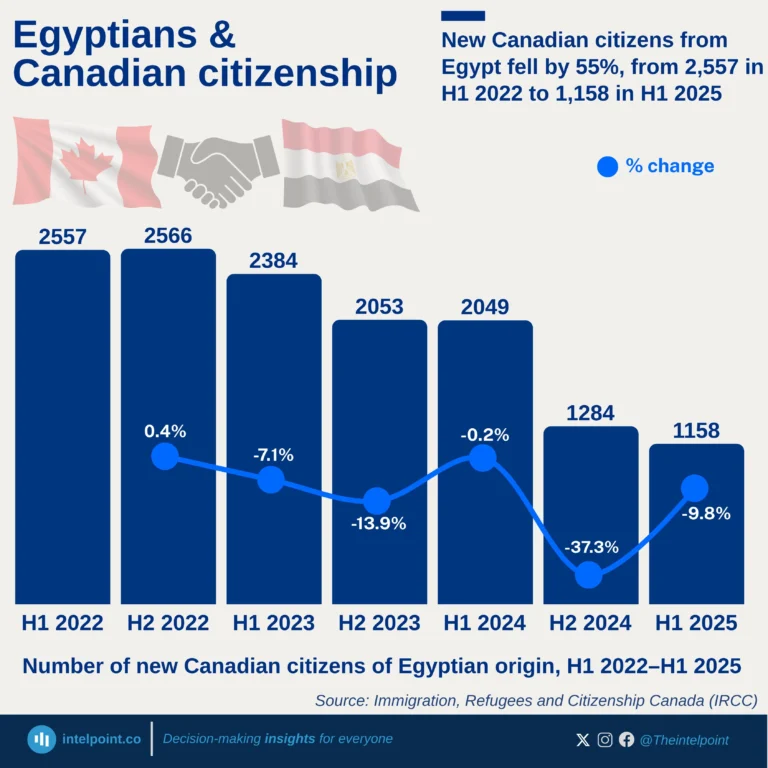 • The number of new Canadian citizens born in Egypt fell 9.8% in H1 2025, reaching 1,158, down from 1,284 in late 2024.