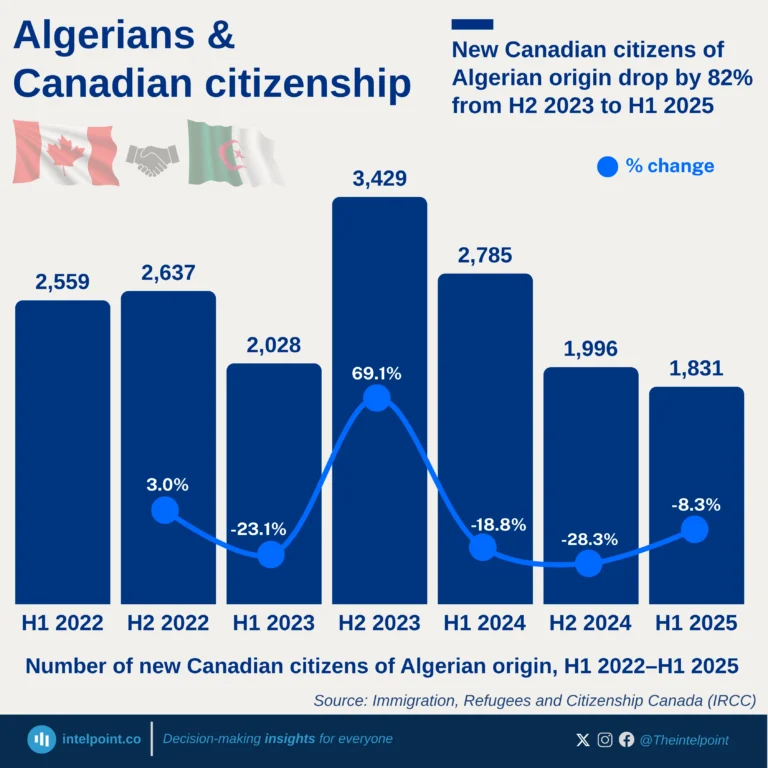 • Between H1 2022 (2,559) and H1 2025 (1,831), naturalisations dropped by roughly 28%, suggesting reduced inflow or slower application approvals among Algerian residents.