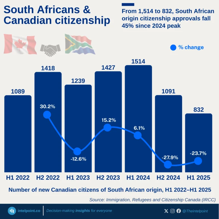 • H1 2025 recorded 832 new Canadian citizens of South African origin, down 23.7% from H2 2024 (1,091).