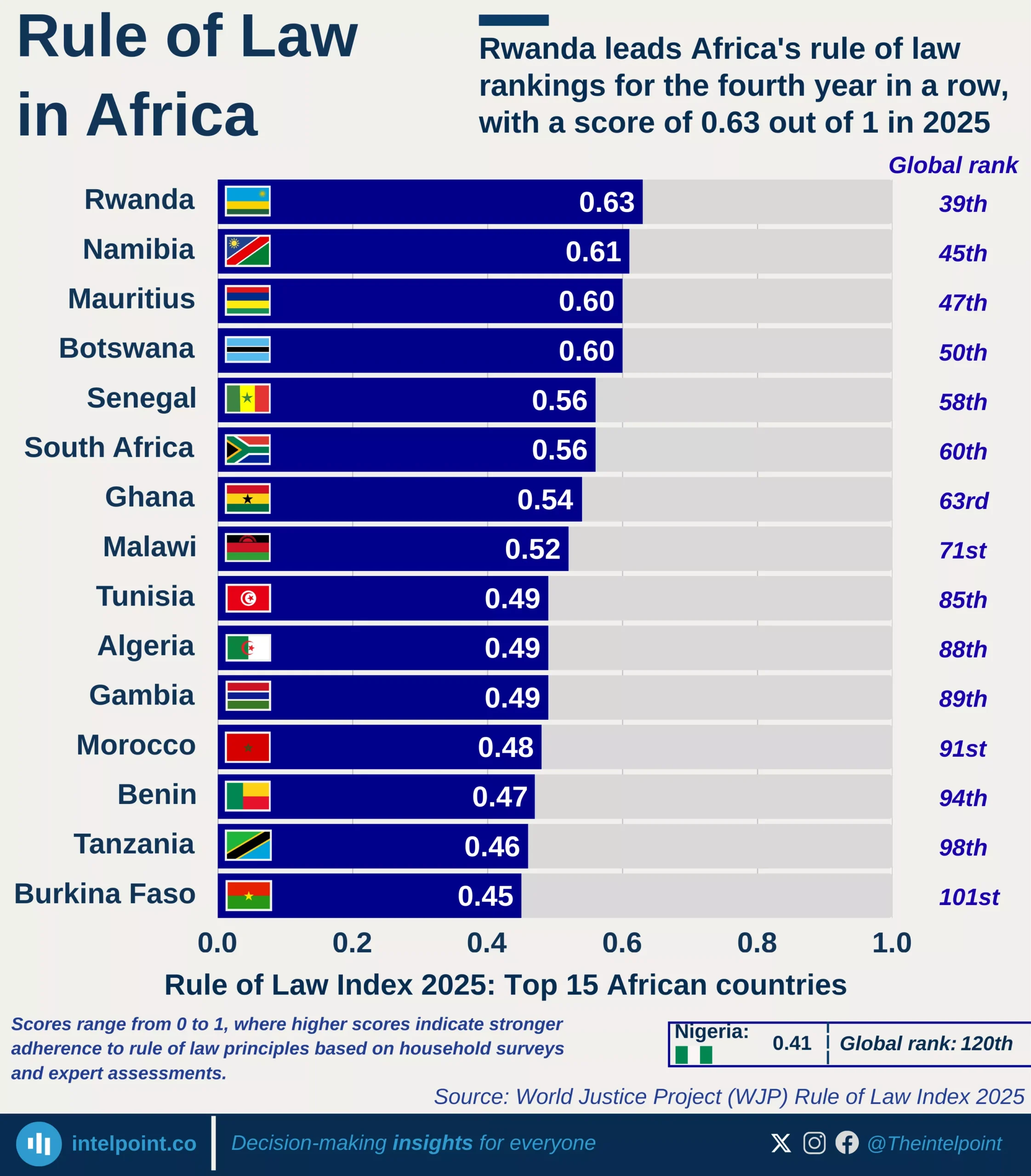 Rwanda is performing relatively well in terms of governance and rule of law, leading sub-Saharan Africa for the third consecutive year with a score of 0.63 in the 2024 Rule of Law Index. Namibia (0.61) and Mauritius (0.60) closely follow, showcasing relatively stronger legal frameworks.